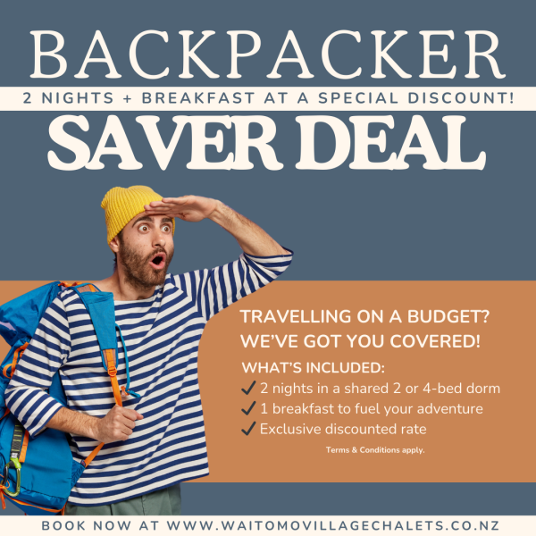 Travelling on a budget? We’ve got you covered! With our Backpacker Saver Deal, you’ll enjoy 2 nights in a 2 or 4-bed dorm, plus a hearty breakfast to start your day—all at an exclusive discounted rate. Whether you’re exploring the glowworm caves, hiking the scenic trails, or just passing through, this deal gives you comfort, convenience, and great value.
